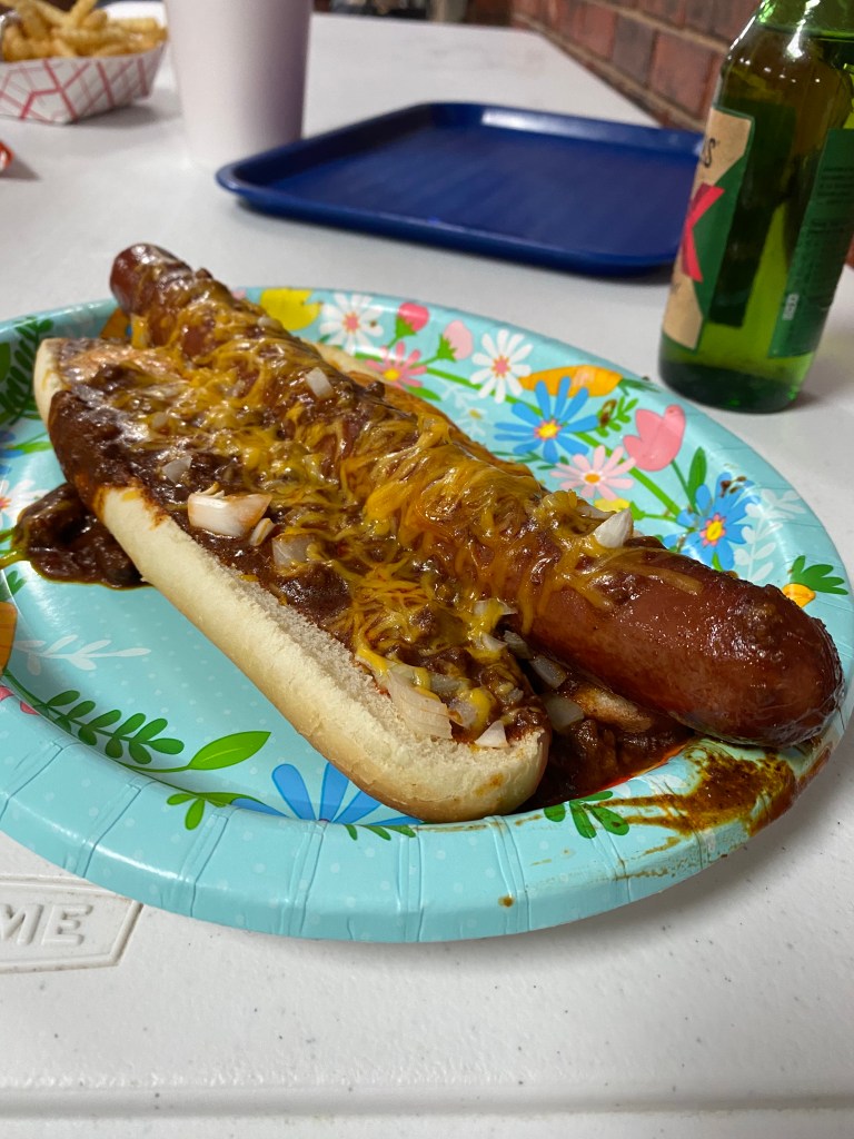 I cut off a piece of coney and bit in. Oh. Em. Gee. It was delicious! Seriously, so good! I never would’ve imagined substituting a sausage for a hot dog, but it worked so perfectly. It was covered in chili that looked amazing and was the perfect level of saucy without being watery. There was a good helping of shredded cheese. I would’ve liked more onions, but I’m an onion lover, so I can never have enough of those. I love a good coney, and the Jim-bo is legit!